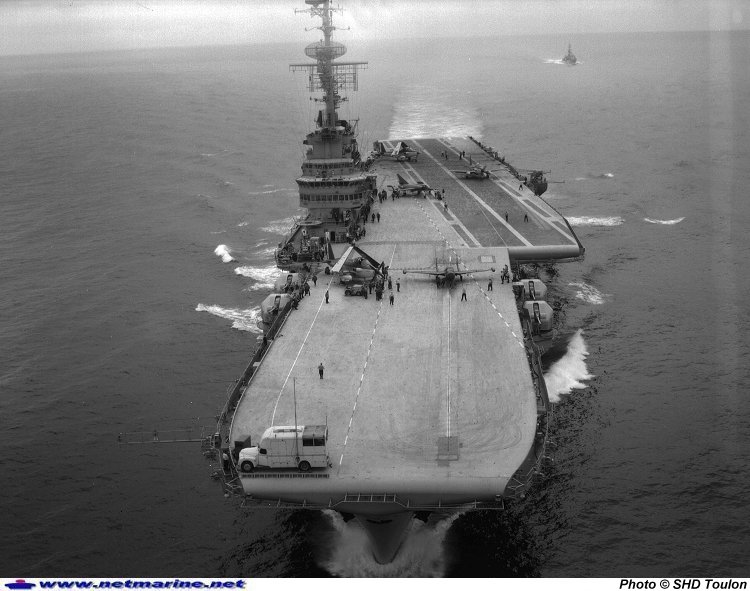 ![]() Sur le porte-avions Clemenceau à la mer au large de Brest, des Aquilon et Alizé pendant les premiers essais de l'Etendard IVM. Remarquez cette petite camionnette sur l'avant Td, sans doute pour enregistrer les paramètres de vol ? (19 septembre 1960).