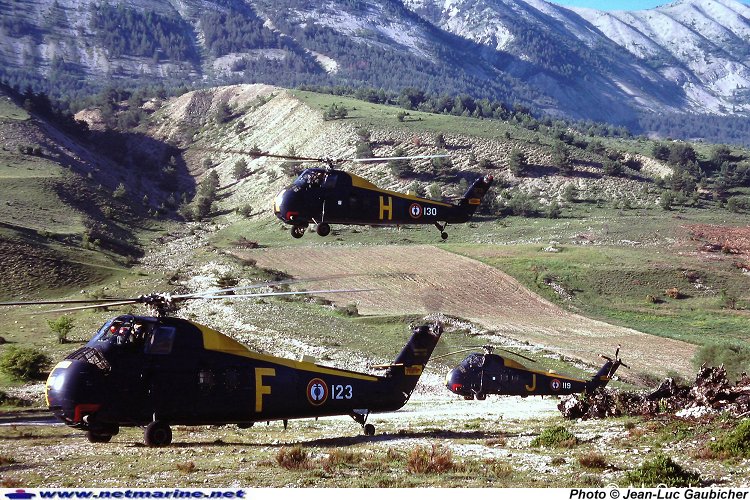 Des hélicoptères HSS de la section Jeanne d'Arc (SJA) lors d'une « nomadisation » à Thorame, Alpes de Haute Provence (juin 1976).
