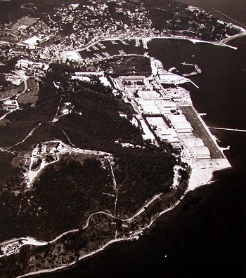 ![]() Vue aérienne de la presqu'île et de la BAN Saint-Mandrier (fin des années 70). |