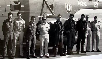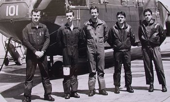 ![]() L'équipage du Super Frelon 101 : PM Neveu, PM Duflocq, PM Bravelec, MT Lemat, QM1 Gallo (plongeur). |