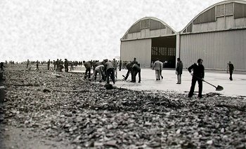 ![]() La piste se retrouve en partie enfouie sous des tonnes de sable, de cailloux et de détritus divers : 400 marins de tout grade s'alignent face à la mer pour déblayer le tout. |
