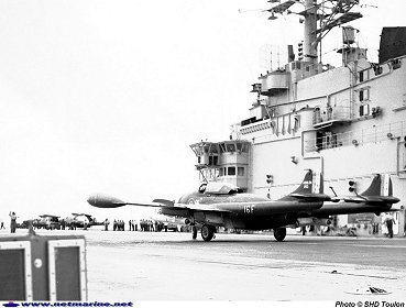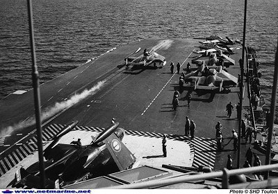 Les détachements de la flottille à Alger s’achevèrent en 1959, mais la 16F fut à nouveau déployée en Afrique du Nord (Bizerte) en avril 1961. Entre temps, elle avait eu la primeur des appontages et catapultages de « jet » sur le Clemenceau, étant déclarée opérationnelle sur porte-avions en novembre 1960. Dépassé techniquement et usé prématurément, l’Aquilon est déclaré inapte à l’appontage en 1963, la flottille 16F s’en sépare et est placée en sommeil le 1er avril 1964, mais pour très peu de temps...