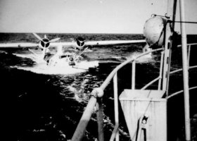 6 Mars 1950 - Quelque part dans le Golfe du Tonkin Sud d'Haïnan, l'Aviso La Grandière est en patrouille depuis des jours. Nous étions en SURMAR (mission de surveillance maritime) depuis des jours et des jours à l'affût des grosses jonques et des cargos venus d'Haïnan. Le ciel était bas et gris, une longue houle berçait gentiment notre bel aviso. Soudain, un appel radio nous prévient qu'un Catalina était en difficulté (panne d'un moteur). Changement de cap et "En avant toute !" et nous voici tous à scruter l'horizon, tentant de repèrer nos "Pingouins" piteusement amerris. Le Catalina appartenait à la Flottille 8F et portait le Serial Number 48358. Le commandant de bord, l'EV1 de Corail, et les 7 membres de son équipage sont indemnes.