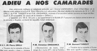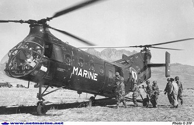 le lieutenant de vaisseau Octobre 1959 : La disponibilité n'est que de 3 appareils. Mais le 10 novembre dans l'après-midi, la 31F passe le cap des 10000 heures de vol. Janvier 1960 : La flottille, continue sa transformation sur HSS1. Trois appareils sont arrivés de métropole. L'un d'eux est opérationnel en fin de mois. En mars 1960, la 31 quitte Sidi-bel-Abbes pour s'installer à la BPAN Lartigue. Elle possède alors 4 HSS et 2 H21C. Le 1er avril, le nombre de HSS étant suffisant pour les opérations dans le Sud Oranais, elle rend ses H21C à l'ALAT. Quelques chiffres (éloquents) sur les services aériens des Banane de la 31F, au cours des 4 années passées : 10759 heures de vol dont 8974 en opérations, 81828 commandos et 8327 passagers transportés, 685 blessés évacués, 406 tonnes de fret, 14 appareils touchés par la DCA, 3 appareils abattus, 5 appareils détruits (dont 3 par accident), 3 morts. En juillet, elle complète le DIH de la 32F à Tiaret. Le 27 juillet, un cinquième HSS arrive. Ce n'est qu'en août qu'arriveront 3 nouveaux appareils, ce qui mène la disponibilité à 8 HSS. En septembre et octobre, elle exécute plusieurs DIH, à Géryville, Bou Semghoun et Flou. Cependant, les activités opérationnelles, comparées à celles du début de l'année, sont en nette régression. 1961 : La 31F forme de nombreux détachements à Thiersville et Aflou. Le 17 janvier, le 31F-6, hélicoptère-canon, intervient près de Berthelot en appui feu. Surpris par des fellaghas lors d'une passe de reconnaissance à vue, un feu nourri et concentré atteint l'appareil qui explose et s'écrase au sol. L'équipage (LV Castaignos, EV Baudoin, SM Baurin, SM Blanchard) est tué sur le coup. En fait, une des caisses de munitions a dû être touchée à travers le plancher par le tir ennemi, faisant exploser l'ensemble de l'hélicoptère. La décision est donc prise de poser des plaques de blindage pour protéger les munitions; surcharge de poids qui impose la suppression du canon arrière. Le 31 janvier, le 31F-2 est touché alors qu'il effectue une EVASAN au plus près des rebelles. Le mécanicien de bord est légèrement blessé. Le 21 avril, le "putsch", mouvement insurrectionnel contre la politique d'abandon, éclate à Alger mais échoue complètement. Depuis, le rythme des opérations est encore assez soutenu, mais il est visible que l'ensemble des militaires a perdu la foi. Le ler juillet