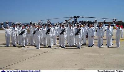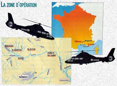 Dans la nuit du 8 au 9 septembre 2002, des orages d'une intensité exceptionnelle provoquaient un déluge dans le sud-est de la France. Le bilan des inondations, 25 morts, auraient été sans doute plus important sans l'intervention rapide des moyens héliportés des 3 armés, de la Gendarmerie et de la Sécurité civile. L'un des tous premiers appareils à se rendre sur place est le Dauphin SP de la 35F, basé à Hyères. Sauvant de nombreuses personnes prisonnières de la montée des eaux sur le toit de leur maison, le Dauphin effectuera plus de 10 heures de vols et 57 hélitreuillages dont trois bébés. 2003 Dans la nuit du 12 au 13 janvier, le chalutier Pépé Roro coule à 80 km des Sables d'Olonnes, après une collision avec le cargo néerlandais Arlow Ranger. Immédiatement alerté, le CROSS Etel envoie trois vedettes SNSM, une de gendarmerie et le Dauphin SP de La Rochelle. Les plongeurs ont pu extirper de la cabine, le corps sans vie du patron pêcheur. Deux matelos sont portés disparus. Mercredi 15 janvier 2003, une pollution par hydrocarbure a été détectée sur les plages entre Ambleteuse et Hardelot (62). Des boulettes et des galettes éparses ont été observées en mer sur une distance de 4 km de long sur 100 m de large entre Audresselles et le nord du cap Gris-Nez à l'occasion des vols de reconnaissance effectués par le Dauphin SP de la 35F du Touquet et par l'avion des Douanes du Havre. La pollution a touché les côtes jeudi 16 janvier. Le Dauphin a récupéré un échantillon de la pollution qui a été analysé à la base navale de Cherbourg afin d'en établir la provenance. Les premières conclusions ont montré que l'hydrocarbure ne provenait ni du Prestige ni du Tricolor. Un échantillon du Vicky sera prochainement analysé. L'Elan est sur zone pour observer l'évolution de la nappe en mer et intervenir en fonction de la pollution observée. Le lundi 20 janvier 2003, vers 14 h, au cours d'un vol d'instruction, un avion biplace de type TB30 Epsilon, de la BA 709 de Cognac, confronté à une panne moteur, a été contraint à un atterrissage forcé dans le marais poitevin, à une quarantaine de kilomètres de Niort. L'avion s'est posé dans des conditions difficiles mais sans causer de dommage aux tiers. Le Dauphin SP de La Rochelle a décollé à 14h25 pour rechercher cet avion. À 15h15, il a localisé les deux membres d'équipage sains et saufs dans le marais poitevin. Les deux militaires de l'armée de l'Air ont été pris en charge à bord du Dauphin et transportés sur la base de Cognac. Le 13 février 2003, le porte conteneurs PO Nedloyd Nina, victime d'un incendie demande assistance. Sur zone arrive le Mérou, une vedette SNSM, le bateau pompe Lacydon du BMP Marseille. A 14h00 un Super-Frelon décolle de Toulon avec une équipe des marins pompiers de Toulon, mais il est contraint de se poser, suite à un problème technique, sur l'île Plane. Un Dauphin et une Alouette transfère alors le personnel vers le navire en difficulté et une équipe de 10 personnes est hélitreuillé à bord. Le sinistre est alors maitrisé et le porte-conteneurs poursuit sa route vers Fos-sur-Mer. Le 24 février 2003, le détachement de service public 35F/Hyères a effectué sa 500ème opération depuis sa création. Le Dauphin et son équipage son intervenus après la perte d'un conteneur par un cargo à 25 nautiques au sud de Toulon. La 35F a localisé le conteneur et treuillé trois plongeurs du GPD Méditerranée à bord du Mérou. Le conteneur a été stabilisé et pris en remorque par le Mérou juqu'à Toulon. Un marin sénégalais a été tué vendredi 13 juin 2003 lors d’une explosion à bord du Chassiron, un navire citerne français de 10 000 t qui naviguait à vide dans le golfe de Gascogne. Le navire a pu rejoindre le port de Bayonne à petite vitesse. Immédiatement après l’accident, trois navires de pêche présents sur zone étaient prêts à intervenir tandis que le Crossa dépêchait l’hélicoptère de la Gendarmerie de Bayonne, le Dauphin SP de la Rochelle, trois vedettes SNSM, le remorqueur Aquitaine Explorer et la vedette Réséda de la Gendarmerie maritime. Un remorqueur et une vedette de sauvetage espagnols offraient aussi leur concours. A la demande de Ceclant, un Super Puma de l’armée de l’Air mettait en place une première équipe d’intervention composée de pompiers d’Anglet. Une équipe d’évaluation composée d’inspecteurs de la sécurité des navires et de représentants de la capitainerie du port de Bayonne se rendait à sa rencontre pour une expertise plus approfondie. Une enquête judiciaire, confiée à la Gendarmerie maritime, a été ouverte par le parquet de Bayonne ainsi qu’une enquête technique menée par le BEA Mer. Le défilé aérien du 14 juillet à Paris a vu la plupart des hélicoptères de l'aéronautique navale représenté : Un Lynx de la 34F vole de concert avec deux autres Lynx de la 31F devant trois Dauphin et Panther des flottilles 35F et 36F et un Super-Frelon de la 32F. 2004 .... Le 2 décembre à 05h50, le CROSSMED a reçu un appel de détresse provenant du voilier Rael, en difficulté à 7 nautiques au large de Marseille. Le voilier battant pavillon espagnol avait à son bord trois personnes dont une blessée à la tête. La météorologie sur zone était un vent de 40 nœuds en rafales et une mer forte. La vedette SNS 073 de Carro s'est immédiatement rendue sur place et l'hélicoptère Dauphin SP a décollé de Hyères et est arrivé sur zone à 07h10 pour hélitreuiller la personne blessée vers l'hôpital de Marseille. Les deux autres plaisanciers ont été évacués par la vedette SNS qui a pris le voilier en remorque. 2005 .... Deux marins-pêcheurs, embarqués sur deux chalutiers immatriculés au Guilvinec (le Brocéliande et le An Triskell), ont été évacués par un Dauphin de la 35F, le 6 novembre, à quelques heures d'intervalle. Blessés à la main en mer d'Iroise, les deux marins ont é