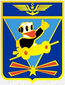 de l'École représente un canard chevauchant un bimoteur entre ciel et mer.