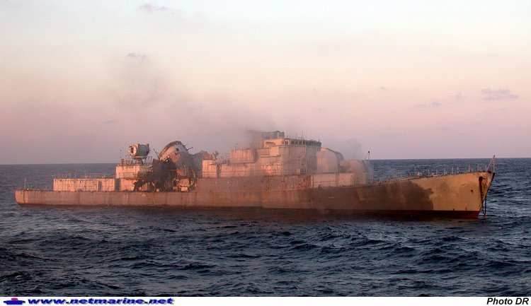 ![]() Adieu à un vieux serviteur de la Royale : la coque de l'ex aviso-escorteur Balny sert de cible de tir au large de Brest. Mortellement touché, le bâtiment disparaîtra quelques heures plus tard par plusieurs centaines de mètres de fond (septembre 2003 - Photo Nicolas Servanton).