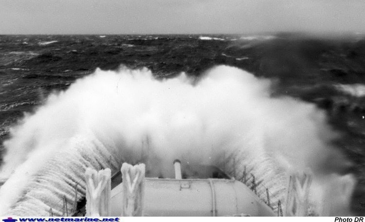 dans la tempête en Atlantique. Le bâtiment avait appareillé de Pasajes en Espagne pour rejoindre Halifax au Canada (1965 - Photo Jean Michel Gérard).