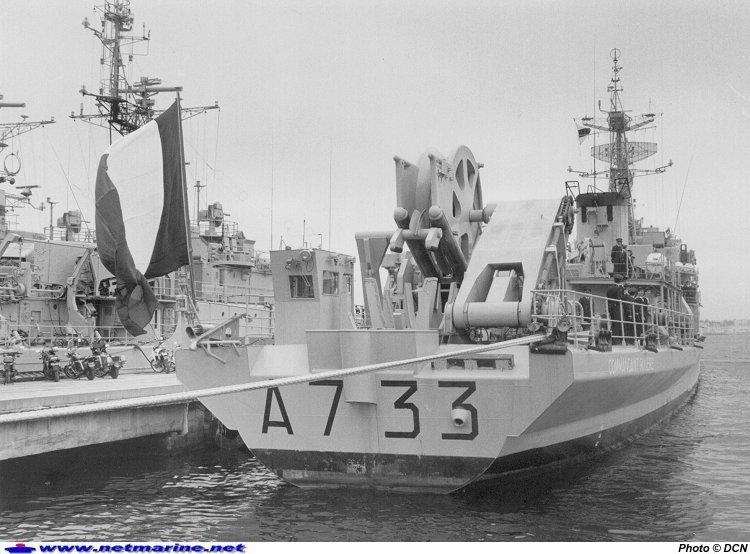 ![]() Le bâtiment d'expérimentations Commandant Rivière à quai à Toulon, Sur la plage arrière, est installé le MSR (Mécanisme du Sonar Remorqué) hérité de l'escorteur d'escadre Casabianca. Tout cela pour expérimenter le futur sonar ATBF (Actif Très Basse Fréquence) des bâtiments de lutte anti-sous-marine (3 avril 1986).