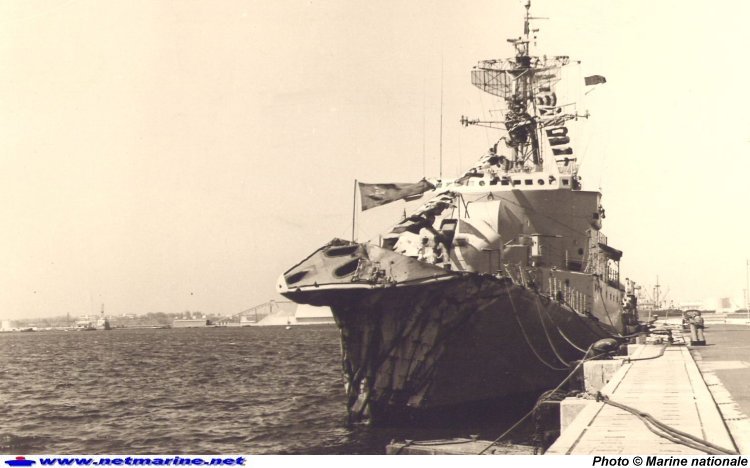 ![]() L'aviso-escorteur Commandant Rivière à quai à Dakar après une collision avec le croiseur Jeanne d'Arc. Cette collision était intervenue le 18 avril 1960 aux environs de 2h00 du matin et avait entraîné la mort de 2 marins sur la Jeanne d'Arc.
