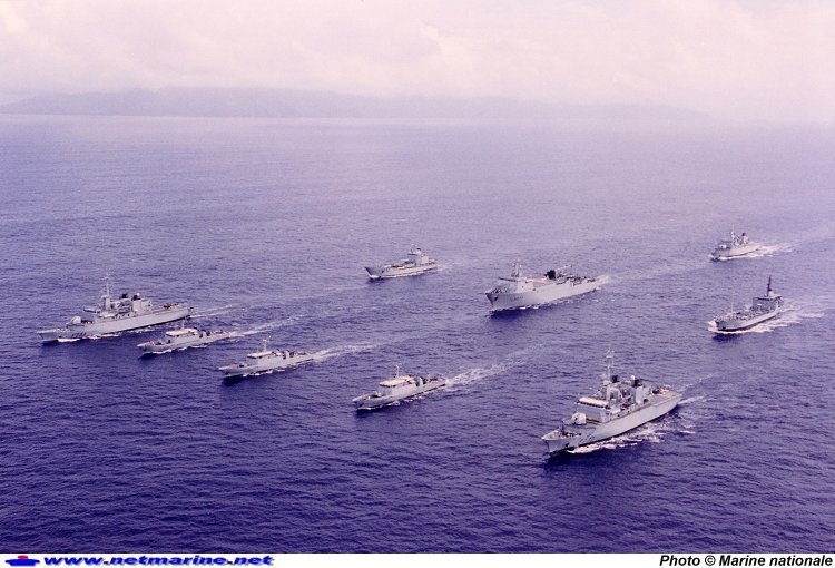 ![]() Magnifique photo de groupe lors d'un stage de remise en condition au large de Tahiti, les frégates de surveillance Nivôse, Vendémiaire et Prairial, les patrouilleurs type P400 La Railleuse, La Tapageuse et La Gracieuse, le Batral Dumont d'Urville , le BTS Bougainville, et le pétrolier Papenoo (août 1994).