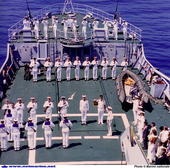 ![]() Cérémonie d'immersion, à bord du Batral Dumont d'Urville, de la dépouille funèbre de Paul-Emile Victor au large de Bora-Bora, en présence de M. Gaston Flosse, président de l'assemblée territoriale, et de nombreuses autorités civiles et militaires (13 mars 1995).