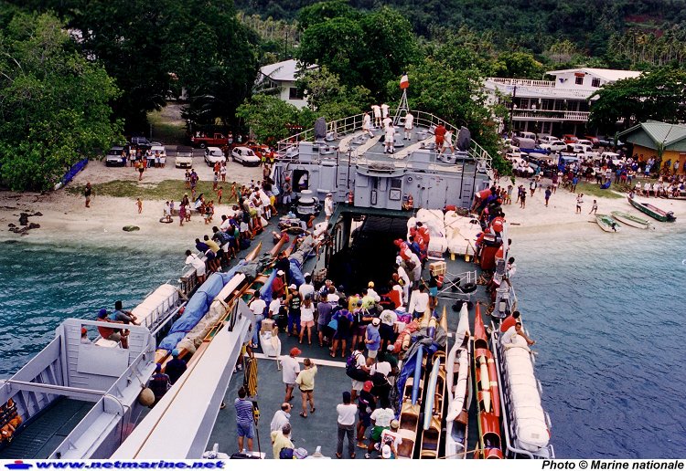 beaché à Huahine à l'occasion d'un transport de pirogues polynésiennes pour la course Hawaiki-Nui (novembre 1994).