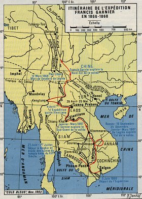 officier en congé à la tête de 200 hommes ! C'est en solitaire qu'il explore ces régions pendant six mois, avant d'être rappelé par l'Amiral Dupré, gouverneur de la Cochinchine. Celui-ci lui donne les pleins pouvoirs pour régler au Tonkin un différend qui oppose quelques colons français aux rebelles. Francis Garnier, officier en congé, se voit confier le commandement d'une troupe de deux cent hommes et quatre canonnières. Il arrive à Hanoï en novembre 1873 et, ne parvenant pas à régler par la voie diplomatique le conflit, s'empare sans coup férir de la citadelle puis envoie des détachements occuper les principales places du delta. Le 21 décembre, alors que les négociations étaient sur le point d'aboutir, la citadelle est attaquée par les "Pavillons Noirs". Les Français résistent courageusement aux assaillants et les obligent à se replier. C'est alors que Francis Garnier sort de la citadelle avec plusieurs hommes et un canon à la poursuite de l'ennemi. A six cent mètres de là, il abandonne le canon et continue sa course avec trois hommes. En tentant de passer une digue dans les rizières, il trébuche et, se trouvant isolé, est mortellement frappé par les "Pavillons Noirs". Ne le voyant plus, ses compagnons se rapprochent et trouvent son corps décapité. Sa dépouille est ramenée à Saïgon où il est inhumé en 1875 aux côtés de Doudart de Lagrée. Telle fut la vie de ce pionnier de la présence française en Asie. Par le rôle essentiel qu'il joua dans le succès de la mission d'exploration du Mékong, par les réflexions que lui inspirèrent ses voyages en Chine et sa parfaite connaissance de l'Empire du Milieu, par les oeuvres qu'il publia au retour de ses expéditions, Francis Garnier demeure l'un des artisans de l'ouverture de l'Asie au monde occidental. Le retour des cendres de Francis Garnier Dans la nuit du 1er au 2 mars 1983, le corps de Francis Garnier, après avoir été exhumé (ainsi que celui de Doudart de Lagrée) furent incinérés. Les urnes furent remis au consul général de France à Ho Chi Minh ville le 2 mars 1983. C'est la Jeanne d'Arc, commandée alors par le capitaine de vaisseau Merveilleux du Vignaux, qui se chargea de ramener en France les cendres des deux explorateurs. Dépôt des cendres de Francis Garnier Le jeudi 23 avril