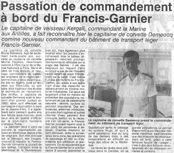 ![]() Le Batral Francis Garnier lors d'une mission à Sainte Lucie au profit du RSMA, Régiment du Service Militaire Adapté (novembre 1994) |