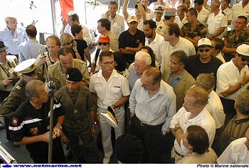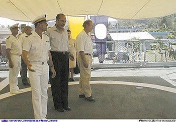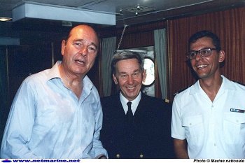 ![]() Le Président de la République, Jacques Chirac, le (futur) chef d'Etat Major de la Marine, l'amiral Delaunay et le CC Pascal Piat, à bord du Francis Garnier . |