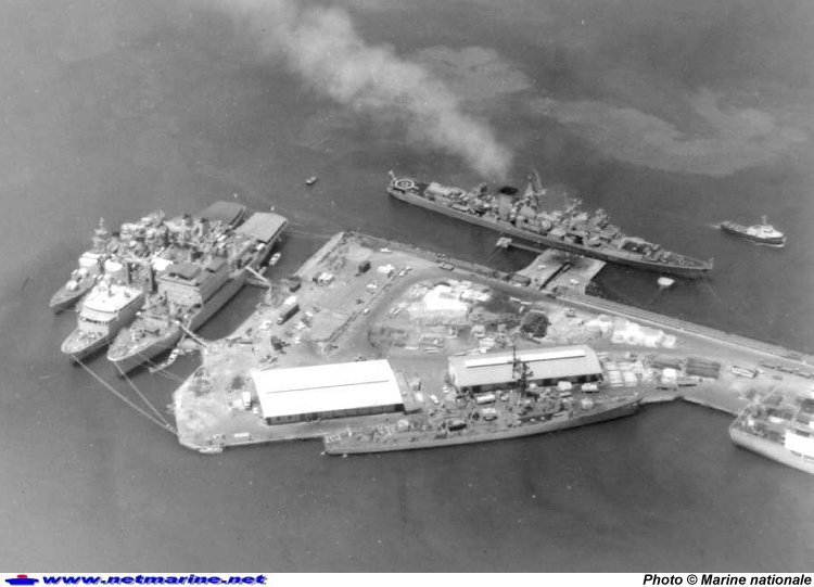 ![]() Le Bâtiment Atelier Polyvalent Jules Verne en soutien à Djibouti, avec à couple le Var et l'Amiral Charner, sur l'autre quai un destroyer soviétique (probablement un classe Kara), et un destroyer américain, probablement type Adams (mars 1986).