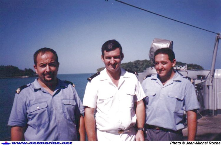 La joyeuse équipe des timoniers sur l'aileron bâbord. De gauche à droite : SM Mur, PM Rossignol, SM Faure.