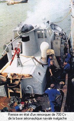 C'est au mouillage, dans le superbe lagon de Mayotte que nous avons entamé la réparation du patrouilleur La Boudeuse et la remise un état de la quasi-totalité de la batellerie de la Marine à Mayotte, placés pour l'occasion à couple du Rhin. Les turbos compresseurs de La Boudeuse furent vérifiés et tandis qu'il était procédé au contrôle du rnoteur babord, celui de tribord était réparé. Quinze jours de travaux et Mayotte nous laissait voguer vers d'autres horizons. L'escale du Rhin à Antsiranana aurait été classique si elle ne s'était inscrite dans le cadre de la coopération régionale entre Marines qui prend la forme d'actions concrètes de formation du personnel et de remise en état d'équipements. Depuis notre retour dans la zone Sud de l'océan Indien, nous recevons des stagiaires qui viennent à bord pratiquer en notre compagnie leur métier de marin et en particulier le quart passerelle. L'escale que nous avons faite à Antsiranana a permis la remise en état complète d'un remorqueur de 700 chevaux de la base d'aéronautique navale malgache. L'équipe soutien du Rhin, se relayant pendant plus d'une semaine a réussi un véritable miracle. A côté de cet important travail qui permet au port d'Antsiranana de disposer à nouveau des services d'un remorqueur puissant, d'autres moins spectaculaires ont été accomplis comme la réparation du radar de l'Edic malgache, le défrichage des abords d'un amer qui disparaissait sous la végétation ou encore la remise en état du réseau téléphonique du consulat de France. Tout en profitant de quelques sorties et notamment d'une sortie vers le lac sacré qui vit les zébus du sacrifice participer au désembourbement des 4x4, c'est un travail multiforme que le Rhin effectua à Diego Suarez. Cent vingt jours de missions, cent vingt jours passés dans un univers qui en ferait rêver plus d'un, mais aussi cent vingt jours d'activité passés loin des siens... La campagne du Rhin en océan Indien devrait s'achever en mars 1996, date a laquelle il rentrera en métropole. L'équipage sera alors en grande partie renouvelé mais il conservera toujours sa motivation, transmise par l'esprit du bateau, pour ce tra- vail de longue haleine, peu spec- taculaire mais rarement ingrat. «L'esprit du bateau"...le Rhin aurait-il une âme ? (Cols Bleus n°2312 juillet 95 - photo Marine nationale/BSM Rhin)