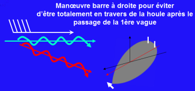 Elle soulève le bâtiment en précipitant son abattée sur la gauche, de telle sorte qu'il retombe dans le creux avec une pointe accusée (15° environ) et en se couchant fortement sur bâbord (la gîte est estimée à 30°) puis effectue une abattée supplémentaire d'environ vingt degrés. Pour contrarier cette tendance, et ne pas tomber plus en travers des lames suivantes, le commandant ordonne « Zéro la barre », puis « A droite 25 ».
