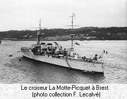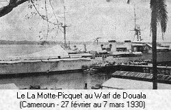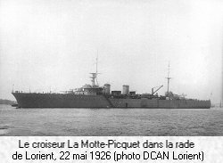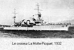 Notre croiseur, la Panthère et le Guépard mouillent à Pointe-Noire (Congo) le 13 mars. Prenant le chemin du retour, les trois bâtiments de l'Escadre légère appareillent le 15 de Pointe-Noire pour de nouvelles escales à Conakry (21-25 mars) et à Dakar (26) où ils restent jusqu'au 7 avril. Les deux contre-torpilleurs mouillent à Mogador le 11 avril. Poursuivant leur route, le Guépard arrive à Mazagan le 13 et la Panthère le même jour à midi, à Casablanca. Au cours de cette même journée du 13 avril, le Lamotte-Picquet se trouve à Safi qu'il quittera le lendemain à 21 heures pour Casablanca où aura lieu le 15 avril le ralliement de l'escadre. Après une escale à Port-Say, nos navires jettent l'ancre à Mers el-Kébir et c'est dans ce port que le 28 avril, le contre-amiral Morris (E.M.J.) succède à la tête de la lère Escadre légère à l'amiral Dubois, arrivé au terme de son commandement. Le même jour également, le capitaine de vaisseau Le Bonzec (J.) devient commandant du Lamotte-Picquet en remplacement du capitaine de vaisseau Duplat. La division se retrouve au complet à Alger le 29 avril et participe le 10 mai, à l'occasion du Centenaire du rattachement de l'Algérie à la France, à un défilé naval devant le Président Doumergue dont le pavillon flottait sur le Duquesne. Le Lamotte-Picquet est également présent à Oran le 12 au moment du départ pour la France de la Division Présidentielle qui est composée des Duquesne, Suffren et Colbert. A l'issue d'exercices avec 1’escadre, le Lamotte-Picquet, toujours flanqué de ses deux compagnons de croisière, touche Ajaccio le 25 mai avant de rentrer à Toulon. Une explosion à bord ! Le Lamotte-Picquet sort avec l’Escadre le 15 juillet, dans les parages du Golfe Juan où des manœuvres se déroulent en présence du vice-amiral Violette, Chef d'Etat-Major Général de la Marine. Le 19 août, à 13h45, deux explosions se produisent dans un compartiment situé sous le carré des officiers. Un matelot est tué sur le coup et il y a trois blessés atteints de graves brûlures dont un, le lieutenant de vaisseau Bossenec, succombera quelques jours plus tard. L'incendie, consécutif à ces explosions qui avaient été provoquées par une fuite d'essence dont les vapeurs s'étaient répandues dans les locaux est éteint à 15 heures. Les dégâts occasionnés au Lamotte-Picquet sont relativement importants… le pont d'acier au dessus duquel se trouvait le carré avait été crevé. Le croiseur est envoyé pour réparations à Bizerte où il arrive le 3 septembre. Placé en disponibilité armée, le Lamotte-Picquet entre en travaux pour un grand carénage dont la date était, d'ailleurs, prévue avant cet accident. Le croiseur revient à Toulon le 23 décembre, travaux terminés. 1931 Pendant la majeure partie de l'année, jusqu'au ler septembre, le Lamotte-Picquet restera en position de disponibilité armée à Toulon. Le 19 août le croiseur avait changé de commandant, le capitaine de vaisseau Le Bonzec passant sur le Duguay-Trouin avait été remplacé par le capitaine de vaisseau Ven (C.E.) venant du Primauguet. Sorti de l'arsenal, le Lamotte-Picquet hisse le 8 septembre la marque du contre-amiral Traub (M.E.F.) qui commandait depuis le 20 avril, sur le Primauguet, la 3ème Division légère exclusivement. En effet, la lère Escadre légère avait été dissoute à cette dernière date ; les contre-torpilleurs qui en faisaient auparavant partie ayant fait l'objet d’un commandement à part, confié à un autre Officier Général. Le Lamotte-Picquet participe aux sorties de l'escadre du 13 octobre et du mois de novembre. C'est ainsi qu'au cours de manœuvres, un groupe placé sous les ordres de l'amiral Traub et composé, en plus du navire-amiral, du croiseur Colbert, des contre-torpilleurs Panthère, Chacal, Guépard, avec les torpilleurs Cyclone, Simoun, Siroco, Foudroyant, Boulonnais et Forbin, séjourne à Majorque (Baléares) en mouillant à Palma, Pollensa et Alcadia du 17 au 20 novembre. Revenu à Toulon avec l'escadre le 27, le Lamotte-Picquet sort une nouvelle fois avec elle en se rendant à Marseille du 16 au 18 décembre. 1932 Le Lamotte-Picquet qui est depuis plusieurs mois l'unique représentant de sa propre division naviguant avec l’Escadre, appareille avec celle-ci le 19 janvier. Le 23, il est une nouvelle fois à Marseille où il prend un mouillage à l'Estaque avec le contre-torpilleur Guépard et les torpilleurs de la 9ème Division (Foudroyant, Boulonnais, Brestois, Forbin). Après avoir exécuté tout un programme d'exercices, il jette l'ancre avec les autres bâtiments de la lère Escadre dans différents ports de la Côte d'Azur pendant la période du Carnaval et rentre à Toulon le 17 février.