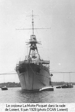 La lère Escadre, venue de la Méditerranée sous le commandement du vice-amiral Docteur, arrive à Brest le 22 juin et la 2ème Escadre - à laquelle manque le Primauguet, pas encore prêt - se range sous ses ordres. Le 3 juillet, en rade du Havre, le Président Doumergue passe en revue nos escadres réunies où figurent les deux croiseurs de la 3ème Division légère. A l'issue de cette grande manifestation maritime, le Lamotte-Picquet revient encore à Lorient le 5 pour quelques petits travaux d’ultime mise au point. Le 20 juillet, il appareille pour des épreuves de conduite de tir au large et rentre le lendemain en instance de départ pour Toulon. Ayant quitté définitivement Lorient le 24, le Lamotte-Picquet rejoint la lère Escadre à la mer et, avec elle, il va à Santander et à Mers el-Kébir pour arriver le 4 Août à Toulon. Le Duguay-Trouin détaché en mission aux Açores n'arrivera que quelques jours plus tard. La durée du commandement de l'amiral Pirot touche à sa fin. Le 20 septembre, à Toulon, il rentre son pavillon, remplacé le même jour sur le Lamotte-Picquet par le contre-amiral Dubois (L.A.). De son côté, à la même date également, le capitaine de vaisseau Duplat (E.A.H.) succède au commandant Huau. Le Lamotte-Picquet accompagne la lère Escadre au cours de sa sortie du 8 octobre au 7 novembre en Corse, Algérie et Tunisie. Il est seul de sa division, le Duguay-Trouin faisant un séjour dans l'arsenal pour une mise au point d'artillerie. Il va à Philippeville du 19 au 22 octobre en compagnie de la 5ème Division légère (Panthère, Chacal, Tigre) ainsi que des torpilleurs Simoun, Siroco, Cyclone et Mistral. Au cours de la dernière sortie de l'année, du 4 au 20 décembre, le Lamotte-Picquet et le Duguay-Trouin accompagnés de bâtiments légers mouillent aux Salins d'Hyères, tandis que les cuirassés vont au Golfe Juan. 1929 Sorti avec 1a lère Escadre du 22 janvier au 15 février à l'époque des fêtes du Carnaval, le Lamotte-Picquet mouille au Golfe Juan avec le Duguay-Trouin qui rentre à Toulon le 11 pour partir en mission au Maroc. Ensuite, avec les contre-torpilleurs et torpilleurs, le Lamotte-Picquet effectue ses écoles à feu les ler et 2 mars. C’est probablement à partir de cette date que commence, sur des affûts doubles, l’installation de ses mitrailleuses de D.C.A. Deux mois et demi plus tard, le 17 mai, le Lamotte-Picquet appareille de Toulon pour Barcelone, à l'occasion de l'Exposition internationale, avec une partie de l'Escadre sous le commandement de l'amiral Docteur, sur la Provence. Nos navires y séjournent du 25 au 28. Le 31 mai notre croiseur est à Alger avec le Duguay-Trouin, la 5ème Division légère et des torpilleurs. Ensuite, appareillage pour des manœuvres avec les autres navires de l'escadre ainsi qu'avec ceux de la 2ème Escadre et séjour à Casablanca du 8 au 17 juin. Au retour les escales prévues à Tanger et Port-Vendres ne peuvent avoir lieu à cause du mauvais temps, aucune communication avec la terre n'étant possible. A partir du 27 juin nos bâtiments - y compris nos croiseurs - font escale à Sète et dans le golfe de Fos jusqu'au 5 juillet avant d'aller à marseille. Dans ce port de nombreuses fêtes et réceptions se déroulent jusqu'au 11, malgré un temps défavorable, avant le retour à Toulon. Le Lamotte-Picquet, toujours en compagnie de son fidèle compagnon le Duguay-Trouin, effectue ses écoles à feu les 23 et 30 juillet. Le 7 août, nos deux croiseurs font leurs tirs d'honneur puis rentrent à Toulon le 9 après l'inspection générale du Commandant en chef. Parti de Toulon pour une courte croisière au Levant, le Lamotte-Picquet relâche à Bizerte le 14 Août. Arrivé à Beyrouth le 18, il visite successivement Latakieh et Alexandrette puis revient à Beyrouth le 25. En septembre il mouille à Rhodes où une délégation de 11 équipage va s'incliner sur les tombes des marins de notre patrouilleur auxiliaire l'Indien, torpillé sur cette rade le 8 septembre 1915 par le sous-marin allemand U34. A Phalère, le 10 septembre, le Chargé d'Affaires de France offre une réception en l'honneur de l'amiral Dubois et de personnalités gouvernementales grecques. Le Lamotte-Picquet rentre à Toulon la 17, La lère Escadre appareille en direction de l’Algérie et de la Tunisie le 16 octobre; elle est, pour la première fois, commandée par le vice-amiral Durand-Viel. Le Lamotte-Picquet, qui attend à Toulon le retour de ses permissionnaires partis plus tardivement que ceux des autres bâtiments en raison de sa croisière au Levant, doit rejoindre l'escadre plus tard. Le Duguay-Trouin, quant à lui, est dans l'arsenal pour travaux et le contre-amiral Dubois doit hisser provisoirement sa marque sur le Primauguet qui est, enfin, arrivé à Toulon le 27 septembre pour compléter la 3ème Division légère. Le 2 décembre le Lamotte-Picquet, en compagnie du Primauguet, sort avec l’escadre pour la côte est de Provence. Après des exercices d'ensemble nos deux croiseurs et les cuirassés mouillent au Golfe Juan jusqu'au 10 décembre et l'escadre rentre à Toulon le 13 au soir. 1930 Le Lamotte-Picquet appareille de Toulon le 6 janvier pour Oran, où, le lendemain, il embarque pour ramener 128 officiers-élèves et 150 hommes d'équipage évacués du croiseur-école d'application Edgar Quinat qui venait de s'échouer. Croisière sur la côte d’Afrique Cette mission du Lamotte-Picquet retarde de deux jours son départ pour une croisière sur la côte d'Afrique avec les contre-torpilleurs Panthère et Guépard (5ème Division légère) ainsi que du Primauguet pour les Antilles. Partis le 17 janvier de Toulon, nos navires s’arrêtent à Casablanca du 20 au 22 et à Dakar le 26. C'est de ce port que le Primauguet mettra le cap sur les Antilles et la Guyane le 7 février. De leur côté, le Lamotte-Picquet, la Panthère et le Guépard visitent la Guinée et la Côte d'Ivoire en allant successivement 
