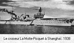 A la fin de ce séjour à Shanghaï, l'amiral Le Bigot met son pavillon sur l'aviso Dumont d’Urville pour remonter le Yang-Tsé. Aussi, le trouvons-nous le 21 juin à Chinkiang, le lendemain à Nanking et à Wu-Hu le 24. L'aviso rentre à Shanghaï avec l'amiral, de très bonne heure le 26 juin. Deux jours plus tard le Lamotte-Picquet appareille au cours de l'après-midi pour se rendre à Chin-Wang-Tao où il arrive le 30. Notre croiseur s'arrête à Tourane le ler juillet, restant plusieurs jours dans ce port qu'il quitte pour aller à Chefoo le 12 et à Wei-Hai-Wei le 15. Il va ensuite à Tsing-Tao pour une très courte escale (20-21 juillet), avant de rejoindre Shanghaï le 23. Le Lamotte-Picquet appareille pour la baie d'Along le 27 où il se retrouve avec le Primauguet au cours de la nuit du 31 juillet. Après quelques jours d'exercices nos croiseurs se séparent ; le Primauguet pour arriver à Hong-Kong le 8 août, le Lamotte-Picquet, après une touchée le même jour à Port-Dayot, rentre le lendemain à Saïgon. Dans le courant du mois d'août le vice-amiral Le Bigot est l'objet d’une citation à l’Ordre de l'Armée. Le 17, le Lamotte-Picquet appareille de Saïgon pour Singapour où il effectue une escale du 19 au 23 avant une croisière aux Indes Néerlandaises. Cette croisière le conduit successivement à Scerabaya (26 août - 6 septembre), Bali (7-13), Makassar (14 et 15) et enfin à Port-Kudat (nord-est de Bornéo) du 18 au 21 septembre. La situation en Europe est à ce moment très critique ; elle se terminera par les fameux " accords de Munich ". Le Lamotte-Picquet se trouve alors aux Philippines ; il est depuis le 23 à Manille avec le Primauguet et les sous-marins Le Tonnant et Le Conquérant qui se trouvaient en croisière d'endurance. L'alerte passée, le Lamotte-Picquet se dirige vers Hong-Kong le 10 octobre ; le lendemain il est devant Port-Dayot, le 12 devant Tourane. Il arrive à Hong-Kong le 15 octobre et reste quatre jours avant d'aller à Shanghaï le 22. Le Lamotte-Picquet séjourne tout juste un mois à Shanghaï, appareillant pour Hong-Kong le 22 novembre où il arrive le 7 après des exercices et un mouillage devant l'île Putu, une des Tshusan. Nous trouvons ensuite notre croiseur en baie d'Along le 2 décembre, avec le Primauguet. Après quelques jours d'exercices, il se rend à Haiphong le 16 et mouille le 29 décembre à Tourane. 1939 Le 3 janvier le Lamotte-Picquet fait route sur Port-Dayot où il jette l'ancre du 4 au 6. Poursuivant sa croisière, il mouille au Cap Saint-Jacques (7-8 janvier) ainsi qu'à Ream (Cambodge) le 10 et le 11 ; passant ensuite devant Poulo-Condore avant d'arriver à Saïgon le 13 à trois heures du matin. A partir du 15 janvier le Lamotte-Picquet entre en travaux pour un grand carénage qui durera deux mois. Malgré l'indisponibilité de son croiseur et la mission du Primauguet au Proche-Orient, l'amiral Le Bigot ne reste pas inactif. Il arbore sa marque sur l’aviso Amiral Charner avec lequel il part de Saïgon le 3 février pour une visite en Thaïlande, à Bangkok. Cette visite se déroule du 6 au 11 et à l’issue l'amiral rentre à Saïgon le 14 février. Il remet sa marque sur le Lamotte-Picquet. Une dépêche ministérielle du 2 mars décide que les croiseurs affectés aux F.N.E.O., même à titre occasionnel, constitueront désormais la 5ème Division de croiseurs. Cette mesure, si elle concerne immédiatement le Lamotte-Picquet, ne concernera qu'un peu plus tard le Primauguet qui se trouvait détaché à Djibouti. Il était pratiquement toujours de règle, en effet, que tout bâtiment se rendant en Extrême-Orient ou en revenant cesse d'être ou passe sous les ordres directe du Ministre à son départ de Colombo (Ceylan) dans les deux sens. Pour le Primauguet, revenant de mission, c'est effectivement après avoir quitté ce port le 5 mai, que le lendemain il fera partie de la 5ème Division de croiseurs. Disponible le 15 mars, comme prévu, le Lamotte-Picquet reprend la mer et le 17 il arrive à Tourane où il restera jusqu'au 20. En cours de route il avait effectué des essais de bon fonctionnement consécutifs à son grand carénage et jugés satisfaisants. A partir du 21 mars, le croiseur est en baie d'Along avec l’aviso Rigault de Genouilly ; les 29 et 30 il est à Fort-Bayard. Le Lamotte-Picquet va ensuite à Hong-Kong du 31 mars au 17 avril. Il passe au bassin du Taikoo Dock (2-3 avril) où son gouvernail, qui manifestait un jeu excessif est démonté et réparé. Egalement ses turbines B.P. tribord interne et H.p. tribord externe sont ouvertes et examinées. Le Lamotte-Picquet effectue des essais à grande vitesse ; mais, le 19 avril, en raison de la nouvelle tension en Europe (Tchécoslovaquie) il reçoit l'ordre de se replier sur Saïgon où il arrive le 23.