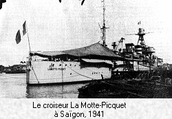 Le croiseur est très actif en juin : du 6 au 11 il va à Can-Ranh et au Cap Saint-Jacques, ensuite à Quinhon (12 au 17) et à Duan-Dai (17-19). Il est de nouveau à Cam-Ranh du 20 au 23 avant d'arriver à Saïgon le 26. Le Lamotte-Picquet passe les mois de juillet et d'août à l'arsenal de Saïgon. Depuis un certain temps déjà ses chaudières montraient des signes évidents de fatigue et sa coque exigeait un passage au bassin - celui de Saïgon n'était pas assez long pour le recevoir. En songeant à son état général, il ne faut pas oublier que le Lamotte-Picquet était en Extrême-Orient depuis plus de cinq ans et demi. Aussi, après avoir vainement cherché à se procurer des tubes de chaudières jusqu'aux Etats-Unis, il faut se résigner à faire appel aux japonais. C'est ainsi que le Lamotte-Picquet appareille le 8 septembre pour Osaka où il arrive le 15. Il effectue un rapide carénage dans l'arsenal japonais avec passage au bassin du 17 au 22. Dès le 27 il repart pour Saïgon en compagnie du cargo français Kindia des Chargeurs Réunis. C'est sur cet ancien bananier qu'avaient été embarqués les précieux tubes de chaudières. En cours de route les deux navires subissent un violent typhon du 30 septembre au 2 octobre dans les parages de Kiusiu. Pendant quarante huit heures le Lamotte-Picquet doit mettre à la cape et le Kindia et son chargement sont en grande difficulté. Nos deux navires atteignent enfin Saïgon le 9 octobre. Le croiseur n'a pas d'avaries majeures. Néanmoins, il sera indisponible du 10 octobre au 17 novembre pour travaux consécutifs à ses avaries de mer. 1942 Sans la remise en état de ses chaudières le Lamotte-Picquet pouvait être considéré comme n'ayant plus aucune valeur militaire. Quoique toujours en situation " armé ", il devient indisponible à partir du mois de mars. Le Commandant de la Marine qui a fait entreprendre le retubage des chaudières ainsi que d'autres travaux, les fait exécuter en les fractionnant de façon que pendant toute leur durée - environ six mois - le bâtiment soit au plus à un mois d'appareillage. Il espère que quatre chaudières pourraient être terminées début août et que le Lamotte-Picquet, sauf imprévu - car la bataille fait maintenant rage dans le Pacifique - pourra être prêt au cours de la première quinzaine de septembre. A l’issue de ces travaux, estime l’amiral Bérenger, le croiseur pourra donner 25 noeuds et une nouvelle fois il sera apte à faire encore campagne pendant plusieurs années ! L’amiral n’était-il pas trop optimiste ? En tout cas, même si les réparations ont pu se dérouler selon le plan prévu, toute cette peine se révélera finalement inutile car le Lamotte-Picquet ne reprendra plus la haute mer. Nommé par un décret en date du 23 mai 1942, un nouveau commandant, le capitaine de vaisseau Poher (E.E.Y.) prend au mois d’octobre le commandement du Lamotte-Picquet. 1943 Cet officier supérieur conservera ses fonctions jusqu'au 31 décembre. C'est vers cette date, après un dernier appareillage, que le croiseur sera mouillé en rivière dans le Donnai, devant la pyrotechnie de Thanh-tya-ha. En effet, les autorités ne disposent plus de mazout pour faire naviguer le Lamotte-Picquet qui est ainsi contraint à l'inactivité. 1944 Le croiseur abrite l’Ecole des marins annamites et depuis le 1er janvier, il est commandé par le capitaine de corvette Mottez (J.A.G.), son ancien commandant-adjoint. 1945 Muni par précaution d’un illusoire camouflage qui s’étend depuis le haut du télépointeur des 155 mm jusqu’à la passerelle, le Lamotte-Picquet atteindra ainsi le 12 janvier 1945.