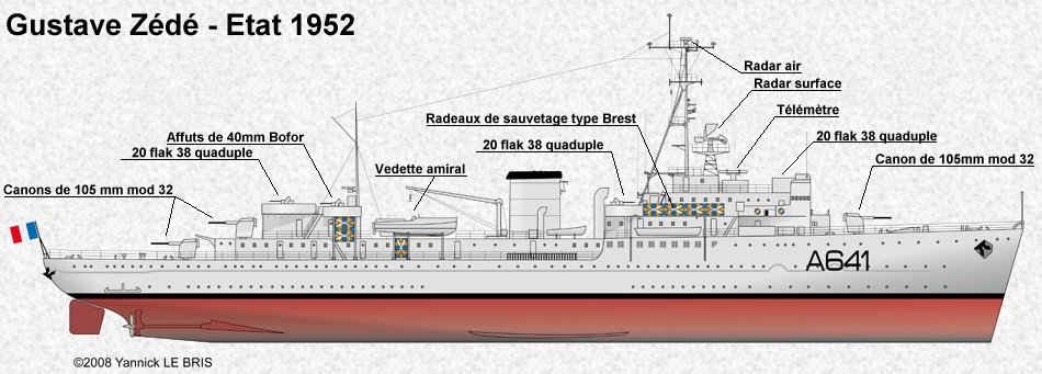 de 20 mod 38 (CAQ) ; 2 affûts simples de 40 Bofor (barbettes
