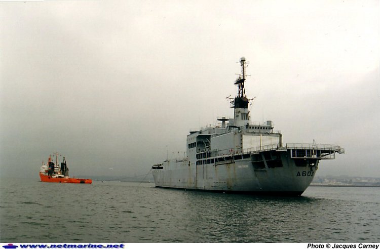 part de Brest pour son ultime voyage vers un chantier de démolition à Bombay (Inde), remorquée par le supply russe Neftegaz 62 (16 novembre 1993).