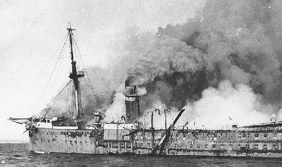 ![]() L'incendie du transport Vinh-Long (16 décembre 1922 - Photo US Navy) |