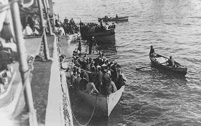 ![]() Le destroyer Bainbridge récupère les rescapés dans les chaloupes (16 décembre 1922 - Photo US Navy) |