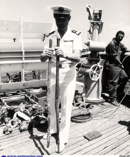 ![]() A bord du Vinh-Long lors de l'opération "Bonaparte" de recherche des épaves de la flotte française dans la baie d'Aboukir. Le CF De Malézieux du Hamel montre 2 chevilles en bronze (Juin 1983 - Crédit photos : J.F. Maréchal - SOFRAS).