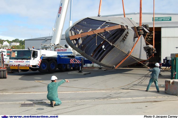 Retournement de la coque du bâtiment d'instruction à la manoeuvre