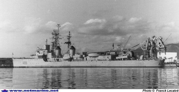 transformé en bâtiment d'expérimentation, à quai à Toulon. Remarquez l'immense portique qui permit d'expérimenter le sonar remorqué à immersion variable (octobre 1969).