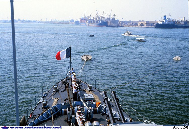 aux postes de manoeuvre à l’embossage à l’entrée du canal de suez avant d’appareiller pour vers Djibouti et une mission ZMOI (octobre 1987 - Photo © Charles de Batz).