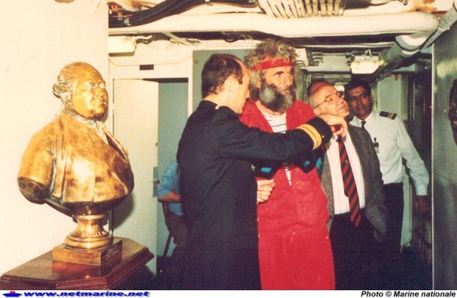 présente à l'entraineur, Daniel Herrero, les objets de tradition du bâtiment (septembre 1989).