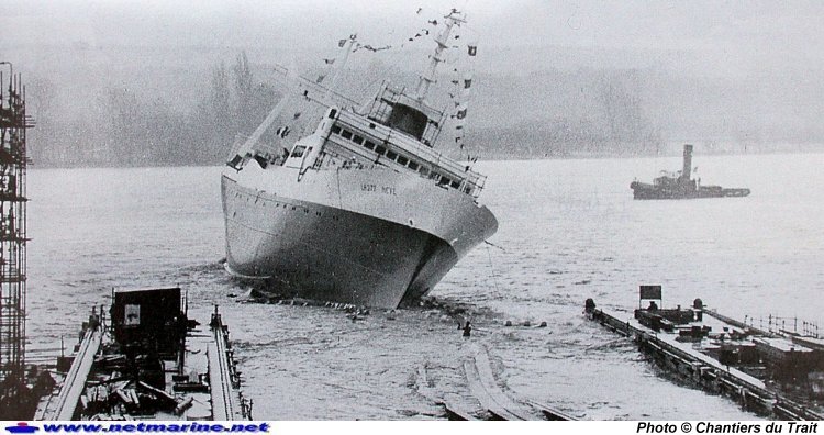 ![]() Le lancement du chalutier-congélateur Névé aux chantiers du Trait(12 décembre 1966). Personne ne soupconnait à l'époque qu'il deviendrait, après plus de 15 ans de bons et loyaux services, propriété de la Marine nationale sous le nom d'Albatros.