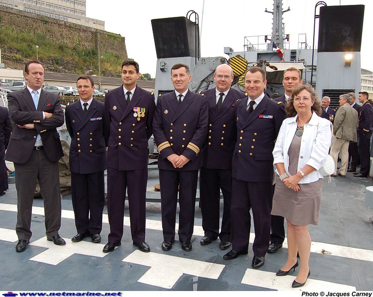 ![]() De gauche à droite : CV (R) Laurent Grassin - CF ...?, LV Riaz Akhoune (dernier commandant), CV Bruno Wattecamps, CF Bruno Sciascia, CV Olivier Bodhuin, CC Stéphan Litzler, Mme Sirdey (veuve de l'amiral Christian Sirdey, premier commandant) réunis à l'occasion d'une cérémonie de tradition liée à la dissolution de l'équipage et au départ du commandant à bord du patrouilleur La Fougueuse à Brest (21 juillet 2009).