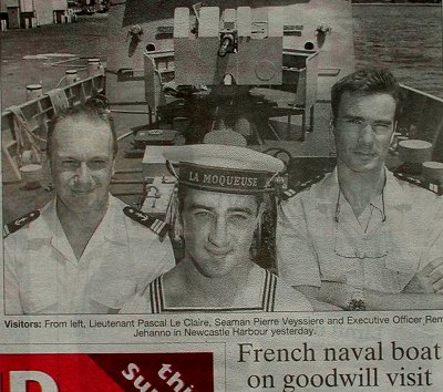 L'année se termine par l'inévitable exercice Cagou (12 au 15 novembre) avec La Glorieuse, suivi d'une PEI (19 novembre au 21 décembre). 2002 Après une surmar en ZEE de Nouvelle-Calédonie (7 au 17 janvier) avec mouillage à Ouvéa (12 au 14 janvier), ce début d'année rompt avec la monotonie des missions habituelles. En effet, le ... janvier, La Moqueuse découvre un palangrier taïwanais, le Li-Shen, en pêche illégale dans la ZEE de Nouvelle-Calédonie. Un tir de semonce sera nécessaire pour stopper le pirate. Cette opération concrète, menée en coopération avec le Gardian de la 25F basé à Tontouta, enthousiame l'équipage. Si la Nouvelle-Calédonie ne concède de licence de pêche qu'à des armements français, ce n'est pas le cas de Vanuatu, archipel à une journée de navigation au Nord, qui autorise certains pêcheurs taiwanais ou japonais à exploiter la ressource de sa ZEE. La contiguïté de ces zones entraîne une vigilance particulière de la Marine, sous forme de missions SURMAR par Gardian et P400, y compris au profit de l'Etat ni-vanuatu au titre de la coopération. Reprenant la mer, La Moqueuse effectue un exercice Cagou (28 au 31 janvier) avec La Glorieuse et le patrouilleur vanuatais Tukoro, puis entre en PEI (18 février au 15 mars). Du 16 au 17 mars, l'équipage effectue un camp de brousse (') avec le RIMAP/NC. Une mission plutôt inhabituelle est l'immersion de monnaie périmée au profit du Haut Commissariat le 22 mars. Suit une mission à l'étranger avec des haltes à Christchurch (Nouvelle-Zélande - 28 mars au 2 avril), Auckland (Australie - 4 au 8 avril) et Sydney (Australie - 12 au 15 avril)