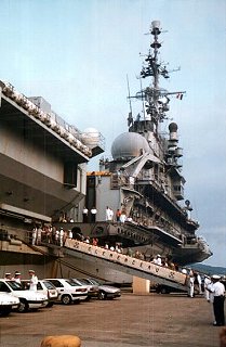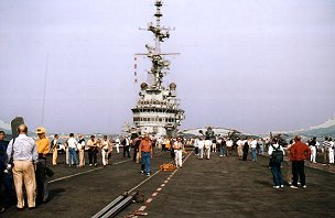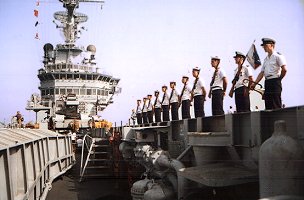 survol du pont d'envol par des Super-Etendard de la 17 F puis appontages. Ces appontages, les derniers pour le "Clem", ont constitués le moment fort de cette journée et c'est au capitaine de frégate Thouvenin qu'est revenu l'honneur d'apponter pour la dernière fois aux commandes d'un Super-Etendard. La veille, ce jeune officier avait pris le commandement de la 17 F, une des flottilles les plus prestigieuse de l'aéronautique navale. Son carnet de vol affiche 2500 heures de vol et pas moins de 200 appontages. Après cette ultime manœuvre aérienne, le "Clemenceau" affiche sur son journal, véritable bulletins de victoires, son 77563 ème appontage! Après une courte pose repas prise dans le vaste hangar, rendez-vous est pris sur l'îlot pour assister au renvoi du groupe aérien qui saluera le bâtiment par un passage en formation avant de regagner Landivisiau via Hyères et Nîmes.