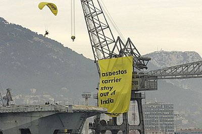 2005 Mais des associations écologistes doutent des chiffres fournis par l'Etat et estiment que la France viole les conventions internationales en exportant des déchets toxiques. Le 12 décembre 2005, un commando de Greenpeace intervient à bord et à proximité du Clemenceau. Six activistes arrivent par voie de mer dans des embarcations. Le septième y parvient en parapente, en s'élançant des hauteurs du mont Faron, qui domine Toulon. Greenpeace entend protester contre la vente à l'Inde de ce navire en raison de l'amiante qu'il contient. Quatre associations, dont Greenpeace, déposent le lundi 26 décembre un référé en suspension devant le tribunal administratif de Paris pour tenter d'empêcher le départ du porte-avions Clemenceau en Inde pour son désamiantage final et son démantèlement. S'en suit une bataille de chiffres opposant l'Etat et les associations sur la quantité d'amiante restant à bord du porte-avions. Le tribunal ne donne pas gain de cause aux association, et, profitant d’une fenêtre météo favorable, l'ex-porte-avions, quitte Toulon le 31 décembre 2005 en direction du port indien d'Alang, où il devrait être démantelé. La coque est remorquée par la Carangue (remorqueur toulonnais affrêté par la Marine) jusqu'au large, puis par le Sumatras, un remorqueur affrété par SDI (Ship Decommissioning Industries), le consortium chargé du désamiantage du navire. La frégate Aconit escorte le convoi.