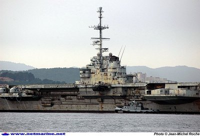 2002 Le Clemenceau est condamné le 16 décembre 2002 sous le numéro de condamnation Q790. Il passe sous la responsabilité du ministère des Finances (services des Domaines), qui gère administrativement le parc des bâtiments condamnés en vue de leur vente et/ou de leur démolition. On évoque alors le projet de le couler en rade de Marseille pour former un récif artificiel au large du Frioul, mais ce projet est abandonné (provisoirement ?). Le rêve marseillais de voir le porte-avions Clemenceau servir de spot de plongée aux amateurs d'épaves est passé. Du moins il n'est plus question, depuis un courrier du 4 novembre 2002 adressé par le vice-amiral d'escadre Collinet, préfet maritime, aux services municipaux, d'envisager son immersion en rade de Marseille. 2003 La coque est vendue par le biais d'une offre publique d'achat le 13 juin 2003 à la société espagnole Gijonese de Desquaces, pour quelques millions d'euros (la France donne le bateau, et le chantier naval se rémunère en revendant près de 30 000 tonnes de ferraille), la coque doit alors gagner un chantier de Gijon pour y être désamiantée avant son démantèlement. Le porte-avions appareille le lundi 13 octobre 2003, aidé en cela par les remorqueurs Lubéron et Estérel.