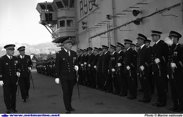 Le contre-amiral Béhic, qui vient d'être nommé commandant le groupe des porte-avions, passe en revue l'équipage du