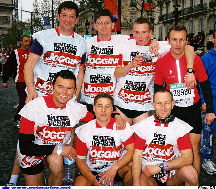 , dont leur commandant, le lieutenant de vaisseau Pascal Huet, foulent le pavé parisien pour le marathon de Paris (10 avril 2005).