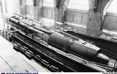 Les sous-marins de chasse du type Aréthuse Le sous-marin, pire ennemi du sous-marin ? En 1955, l'amiral Barjot, alors chef d'état-major de la marine, s'exprimait ainsi : " Le sous-marin à schnorchel à grande vitesse en plongée, est le type de navire le plus redoutable des forces navales modernes, surtout contre les navires de surface. La lutte anti-sous-marine est donc aujourd'hui la mission numéro un des forces navales. Son succès conditionne la maîtrise des mers ". La méthode de lutte anti-sous-marine, qui fut expérimentée au cours de la bataille de l'Atlantique, était la technique du groupe aéronaval " Hunter-Killer ", constitué d'un porte-avions ou croiseur lourd, accompagné de quelques escorteurs anti-sous-marins, et effectuant un genre de battue pour isoler le sous-marin ennemi. L'idée d'y adjoindre en complément un sous-marin dont le rôle serait de participer à la lutte naquit aux USA peu après la fin de la guerre. L'US Navy y inscrivit à son budget 1949-50 trois sous-marins chasseurs de sous-marins dont le premier fut l'USS Barracuda. En France, ce concept est énoncé dès le 5 mai 1948 par l'amiral Auboyneau lors d'un réunion du Conseil supérieur de la marine. Mais à l'opposé des sous-marins type Narval, " c'est un modèle entièrement nouveau, demandant des études prolongées ". L'avant projet, désigné " I-52 ", est présenté au comité technique le 15 mai 1952. L'argument le plus fort avancé était les économies réalisables, grâce à l'emploi de ce type de petits et discrets sous-marins, qui rechercheraient directement au sortir de leur bases ou dans les zones de passage, les sous-marins ennemis. La mobilisation d'une flotte importante ne serait alors plus nécessaire. La construction des sous-marins de chasse est décidée en 1952. Les caractéristiques du projet, sur plan de l'Ingénieur du Génie Maritime (IGGM) Girousse, sont les suivantes : déplacement en plongée 666 tonnes ; une seule ligne d'arbres entraînée par deux moteurs électriques, un de faible puissance dit de "croisière", et l'autre de 1300 CV dit "principal" ; deux groupes électrogènes ; 4 tubes lance-torpilles d'étrave, susceptibles de lancer des torpilles courtes avec 4 torpilles de réserve ; coque épaisse fusiforme, d'échantillonage suffisant pour permettre la navigation à des immersions supérieures à 100 mètres. Les quatre sous-marins de cette série, dont les noms sont empruntés à la mythologie grecque, sont construits à Cherbourg : Aréthuse et Argonaute, sur le budget 1953, puis Amazone et Ariane, sur le budget 1954. Ils sont appelés communément les "400 tonnes" Pour remplir leur mission, les sous-marins chasseurs de sous-marins ont été