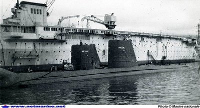 Historique du sous-marin Aréthuse Présentée en recette au cours de sa première sortie à la mer le 21 mai 1958, l'Aréthuse effectue ses premiers essais le 22 et 23 mai, continués du 5 au 7 juin 1958. Après une traversée vers Lorient et retour, des essais les 25 et 26 juin, et une traversée aller-retour à Brest, le sous-marin rentre à Cherbourg le 3 juillet 1958. Une décision du 7 janvier 1958, avait auparavant donné à l'équipage de l'Aréthuse, héritier du sous-marin du même nom qui s'illustra pendant la seconde guerre mondiale, le droit au port de la fourragère verte avec olive croix de guerre 39-45. L'Aréthuse entre en service le 23 octobre 1958. Elle est affectée le 1er février 1959 à la 1ère escadrille de sous-marins (1ère ESM). De 1958 à 1962, ce sous-marin sera basé à Mers el-Kébir (GSM 11 de la 1ère ESM). Le 14 juin 1959, il participe à la revue navale à Oran-Mers el-Kébir. Les sous-marins Aréthuse et Argonaute encadrent le Colbert, bâtiment-amiral, pendant toute l'inspection, sous les yeux de monsieur Pierre Guillaumat, ministre des Armées, et l'amiral Henry Nomy, chef d'état-major général de la marine.