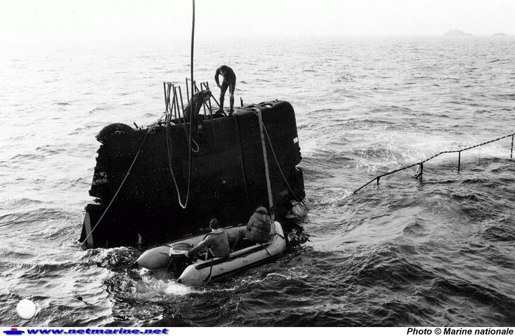 ![]() Les équipes s'affairent autour du sous-marin Ariane qui doit être coulé comme cible statique par 55 mètres de fond en rade de Giens. Cette expérimentation du nom de "Macumba" a pour but d'effectuer des essais de résistance au choc par grenadage (mai 1985).