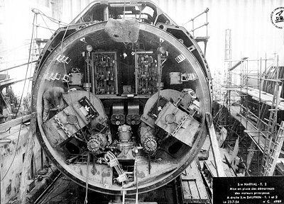 Des méthodes d'assemblage délicates... L'usinage des aciers à haute résistance élastique est aussi délicate. Ce n'est pas l'acier en lui même qui était en cause (c'était quasiment le même que celui qui avait été utilisé pour la construction des sous-marins type Aurore avant la guerre), mais les méthodes d'assemblage nouvelles, notamment la soudure de cet acier par l'arsenal de Cherbourg. La construction du Narval et du Marsouin a rencontré quelques difficultés. L'IGGM Dupont de Dinechin, alors que la construction était déjà bien avancée, a eu des doutes quand à la résistance à la pression des sections avant de la coque épaisse. Une maquette au 1/10e est alors testée en bassin. La calotte avant de la coque épaisse présentent d'importantes voies d'eau avant même d'atteindre son immersion maximale ! Ainsi le Narval et le Marsouin reçurent un système de barre de renfort destinée à empêcher l'écrasement de la coque.