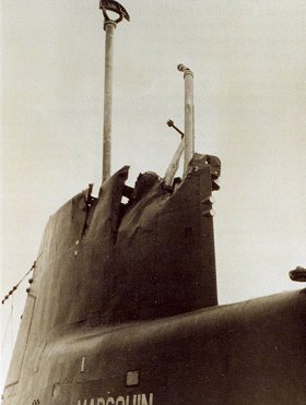 ... et aussi des accidents La carrière du Narval sera marquée par deux accidents majeur. Le 3 mai 1962, alors qu'il navigue à l'immersion périscopique, il est abordé par le pétrolier British Vision. Les dégats sont importants : massif enfoncé, mâts tordus.... et nécessiteront de longues réparations. Plus dramatique, le 3 avril 1966, alors qu'il tente d'appareiller d'un mouillage des Glénans, trois hommes d'équipage et le commandant tombent successivement à la mer par des conditions météo particulièrement mauvaises. Seuls trois corps sans vie seront retrouvés. La carrière du Marsouin sera également marquée par plusieurs accidents. Le 16 novembre 1960, il est abordé, à l'immersion périscopique, par un bâtiment inconnu en Atlantique. Les dégats sont importants et nécessiteront de longues réparations. Le 3 novembre 1961, il est abordé par le caboteur Carentan au large de Lorient. L'étrave et le masque du sonar sont déformés, mais il n'y a pas de blessé. Le 11 novembre 1975, une voie d'eau se déclare en plongée par 200 mètres de fond dans le golfe de Gascogne. Le Marsouin refait surface en urgence, mais l'acide des accumulateurs électriques des batteries se déverse, suite à une forte gite. Six hommes d'équipage sont blessés. Le 5 août 1977, alors en carénage à Lorient. Deux explosions successives au niveau d'une station d'huile, feront un mort et 7 blessés, dont plusieurs gravement brûlés.